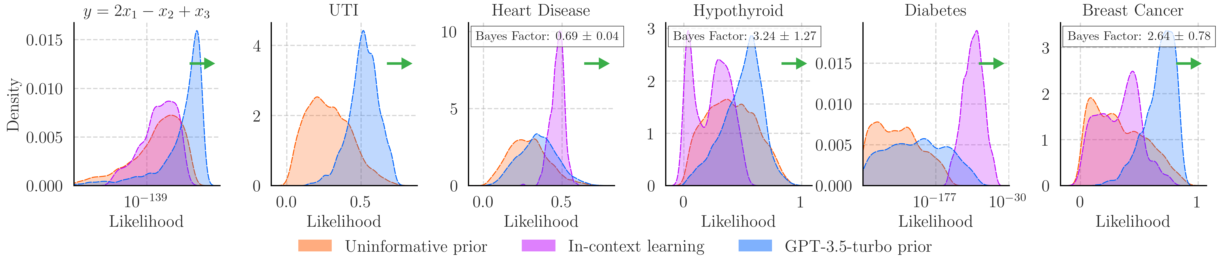 We can also calculate the Bayes factor between the prior elicitation predictions and those made using in-context learning. The figures show the prior accuracy and MSE as well as the prior likelihood on 25 data points from each task. Whether prior elicitation or in-context learning provides greater likelihoods depends on the task, with both methods being the better choice over a non-informative prior for all cases tested. When factoring in the methods' abilities to estimate Bayesian inference and the cost of producing predictions however, prior elicitation is likely the better option for the cases tested.