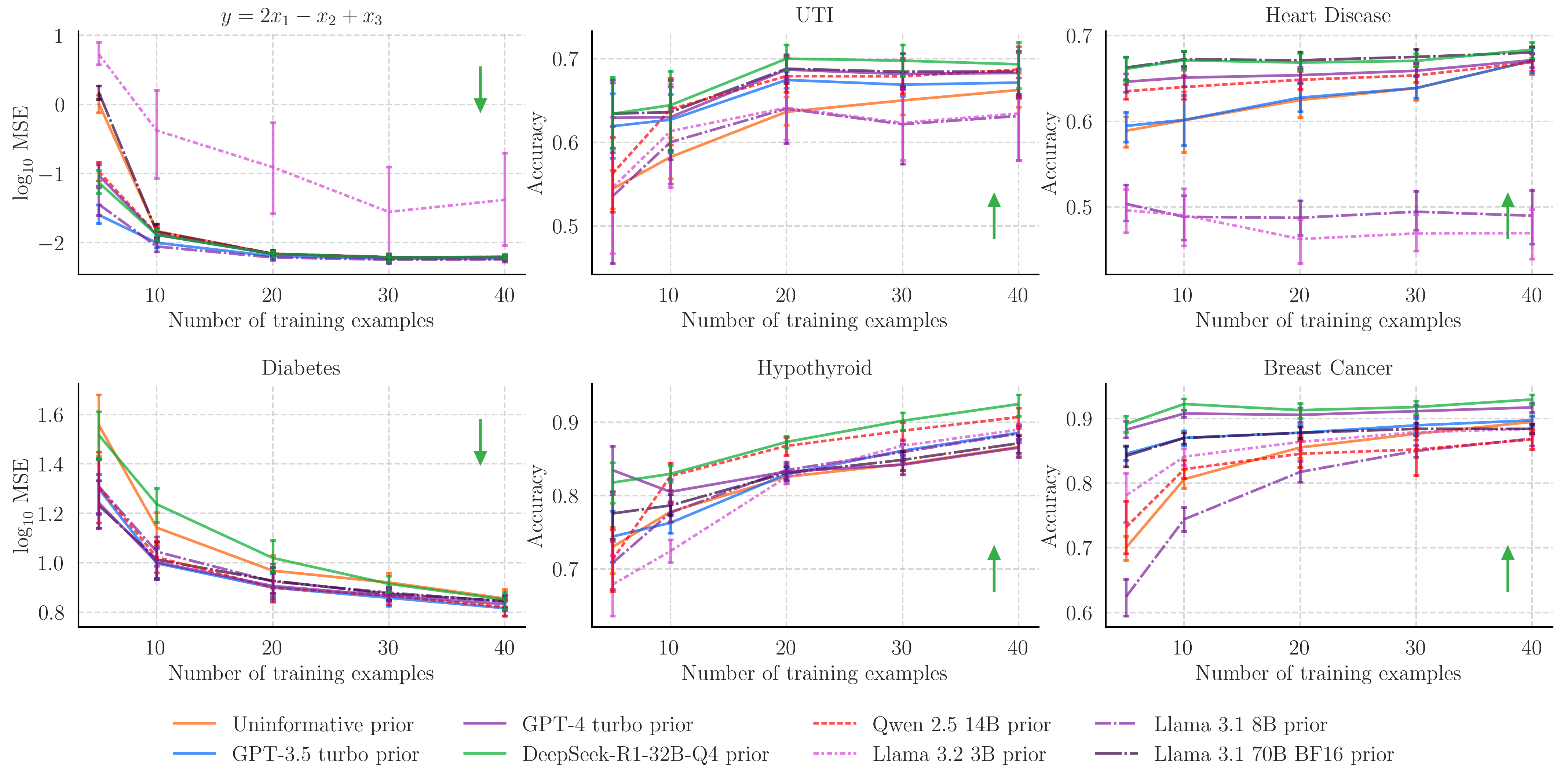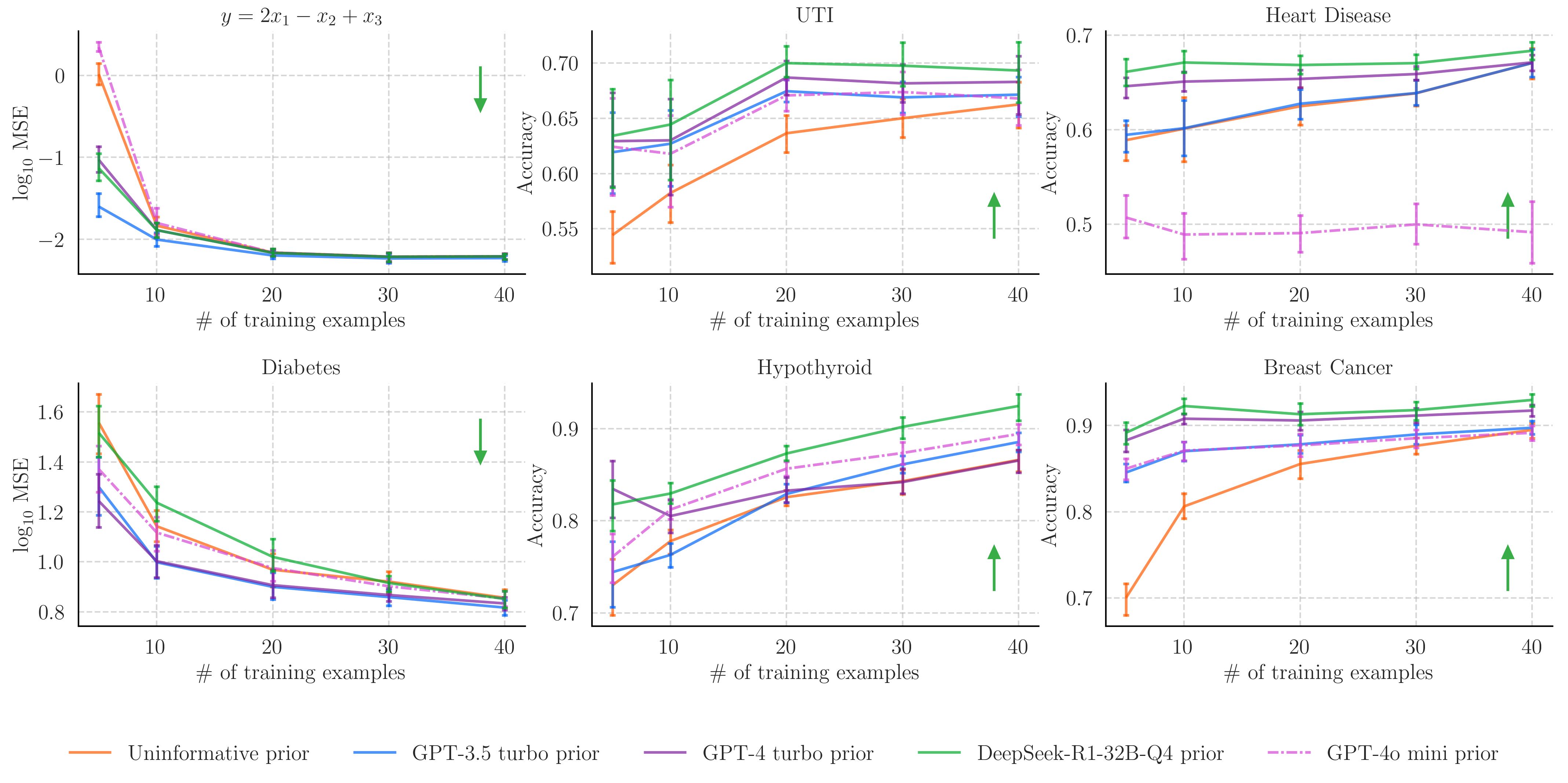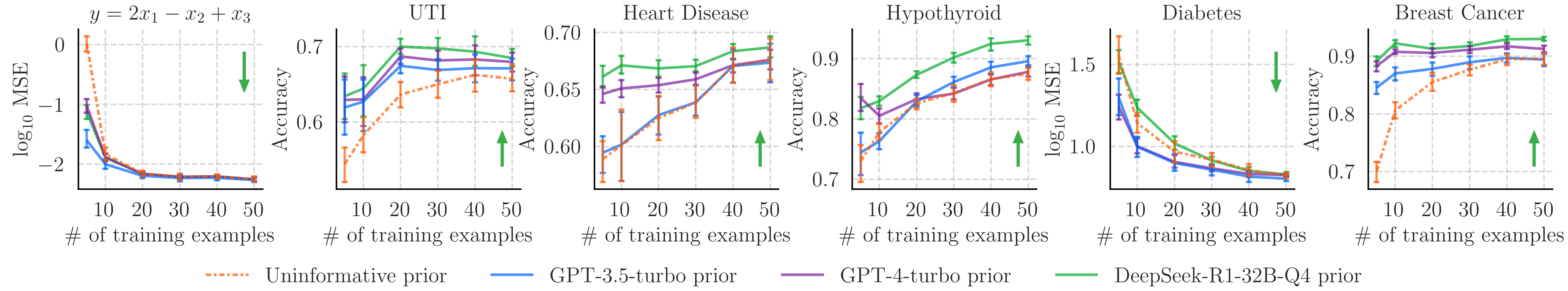 In almost all cases, one of the LLM-elicited priors outperforms the uninformative prior, particularly when data is sparse. This is particularly interesting for the UTI prediction task, where the data is private and will have never appeared in the LLM's training text.