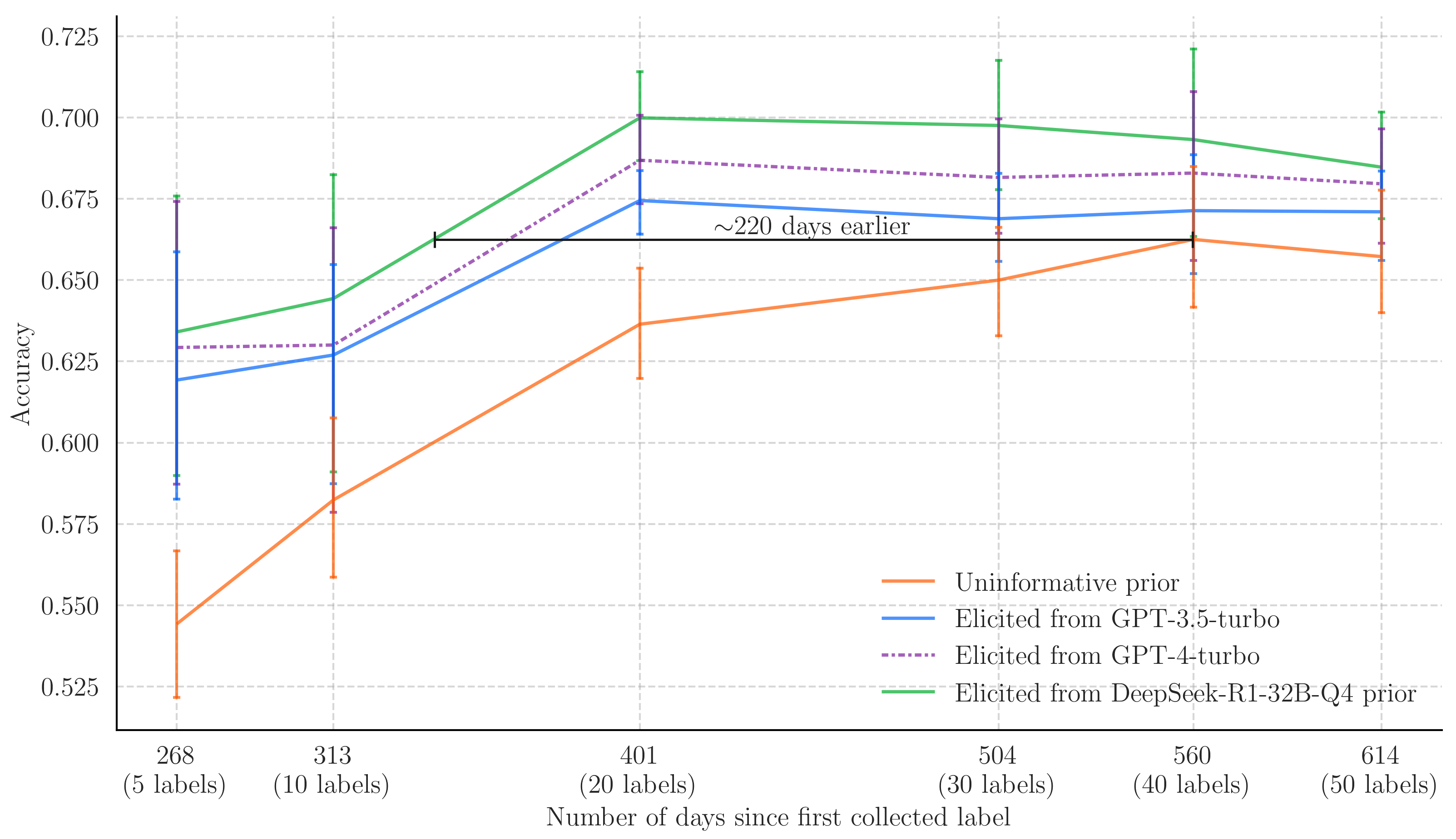 In the figure above we plot the length of time it took to collect a given number of labels against the accuracy of a model using an uninformative prior and one elicited from a language model. This result illustrates the usefulness of prior elicitation, since we can achieve comparable (and ultimately better) accuracy with less data points, and therefore less data collection time.
