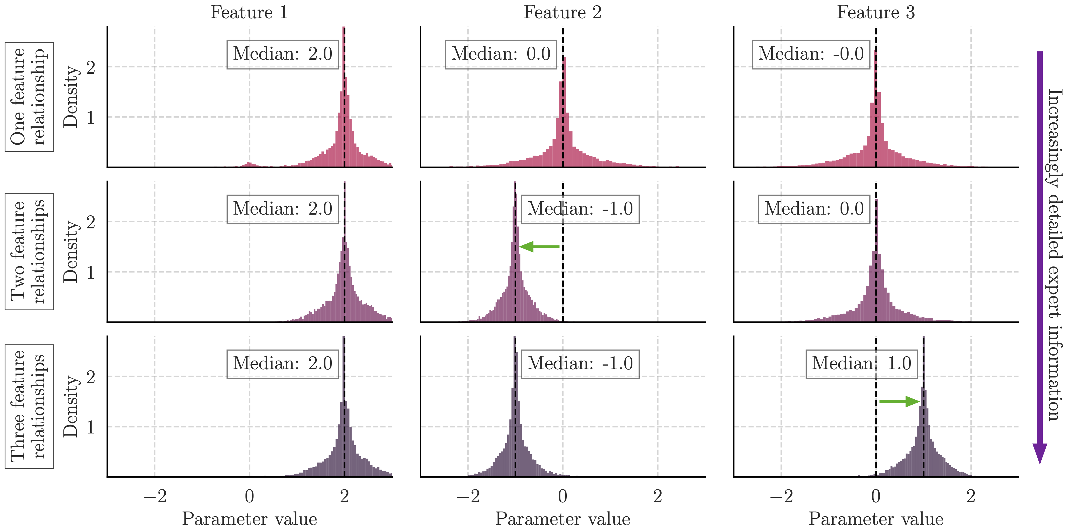 In the following figure, we use the synthetic task as an example. Here, we provide increasingly more informative information about the task to the language model and observe the expected changes in the elicited prior distribution. For each level of information, we describe to the language model how an additional feature relates to the target using natural language.