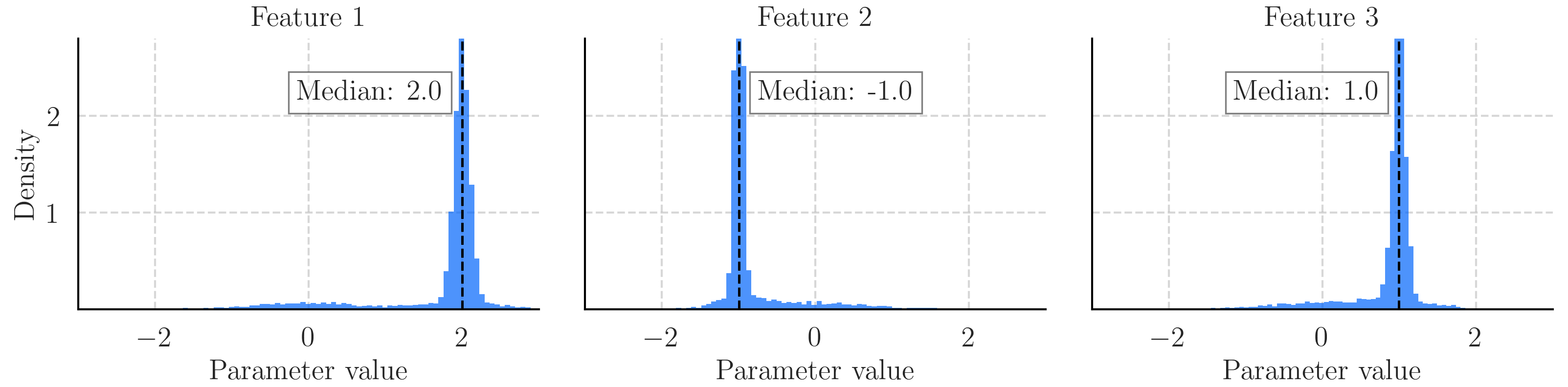 As an example, after combining the elicited distributions from synthetic task above, \( y = 2x_1 - x_2 + x_3 \), we arrive at the following prior distribution on a linear regressor: