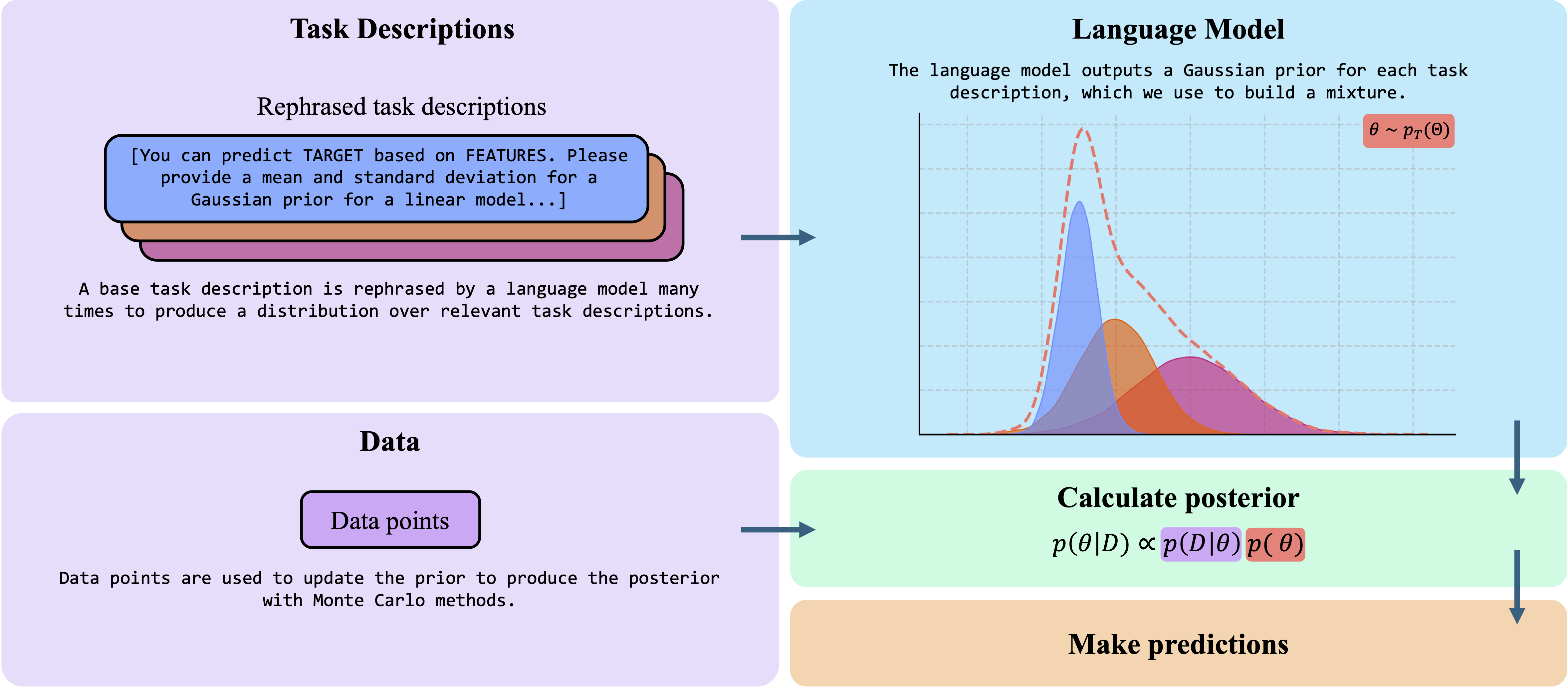 We use these rephrased task descriptions to elicit many Gaussian priors. We obtain a single Gaussian distribution for each feature, for each task description. By using a mixture of these distributions, we can construct the general prior knowledge of the language model on the features of a linear model.