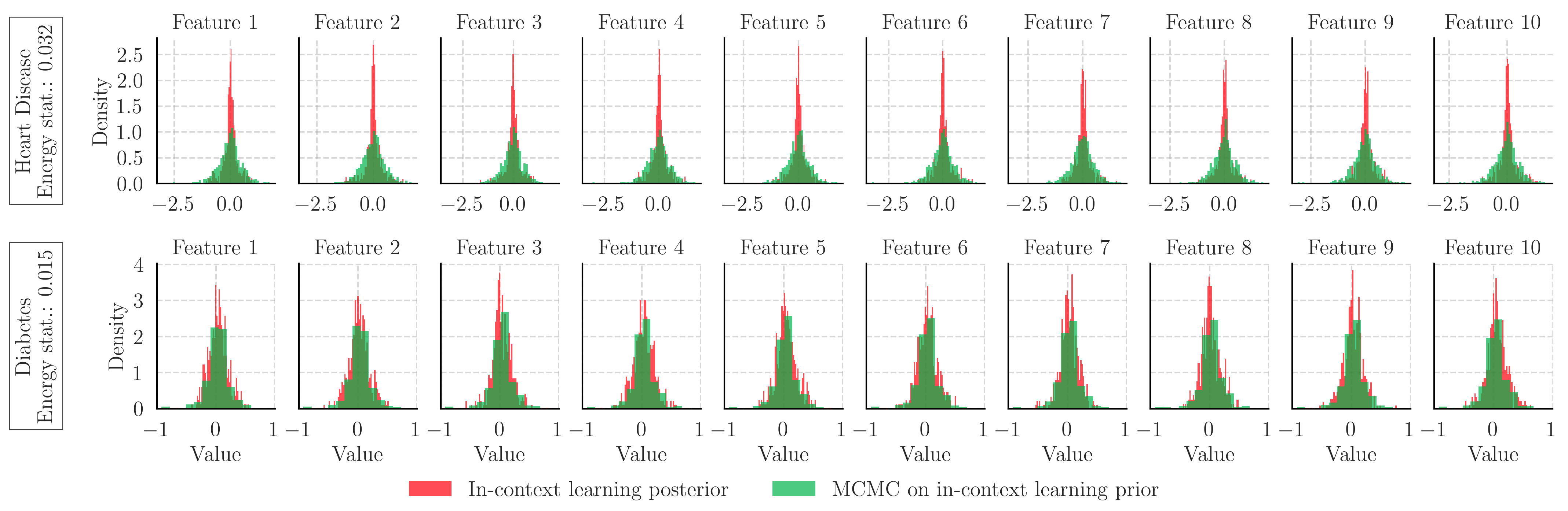 In the case of Heart Disease prediction, the difference in the posterior distributions estimated through MLE sampling and using Monte Carlo methods differ significantly suggesting that the LLM is not approximating Bayesian inference for this task. On the other hand, for the Diabetes predictive task, both distributions are more similar, signifying that in this case the language model is performing Bayesian inference in-context.