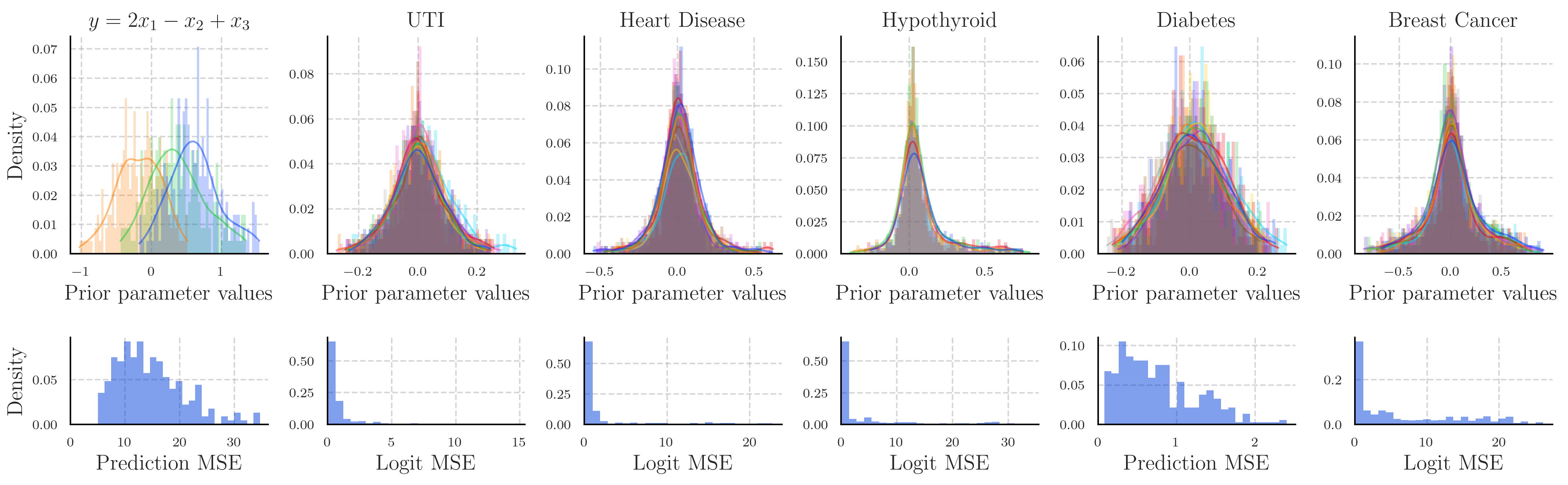 The approximated prior distributions for the in-context learning model are shown above. The upper row shows the histograms of parameters for each of the tasks, whilst the lower row shows the error in our approximations. We measure this by comparing the error in the predictions made using in-context learning and those made by the MLE approximations of the in-context model.