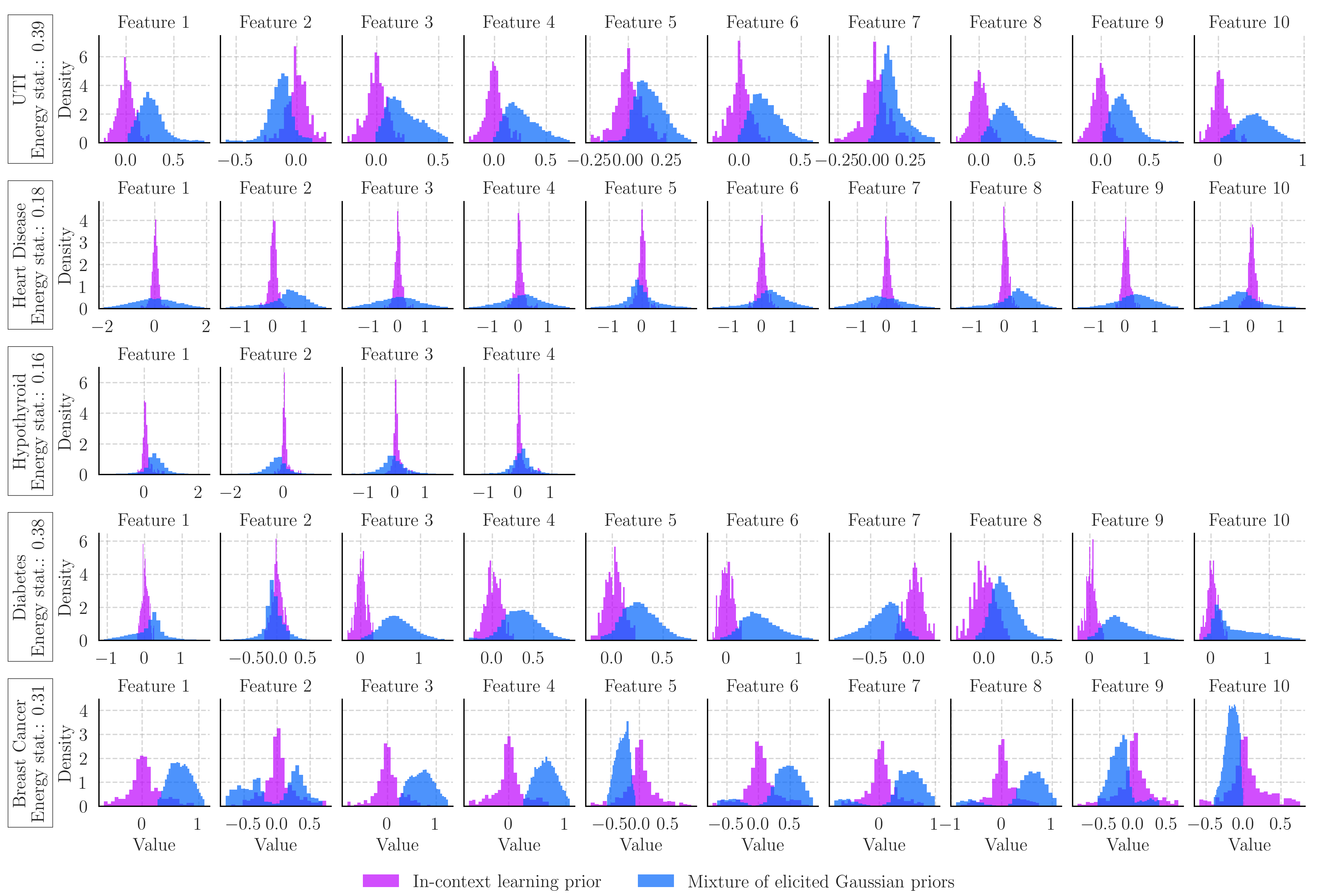 In the figure below we can then compare visually, and using the energy statistic, the difference between the approximated in-context prior distributions and the ones elicited from the language model. Discounting the synthetic task which shows a high error in our approximation, we see that the distributions elicited from the LLM differ significantly from those used by the language model in-context. Either the language model is not reliably returning its own priors when we perform prior elicitation, or it is not using that prior knowledge when making predictions in-context. We suspect the latter, since the elicited priors match our expectation on the UTI and synthetic tasks, and the in-context priors often centre around 0.