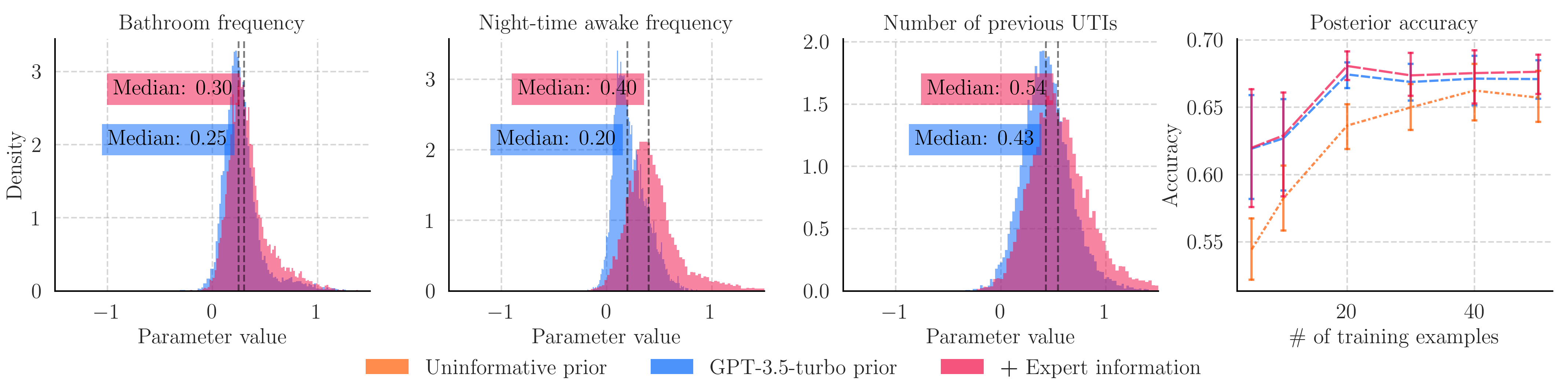 This figure shows how the language model updated its previously elicited prior distribution for the UTI task. As we can see, the LLM-elicited distributions already captured the correct correlation direction, but our additional information resulted in prior distributions with a greater value. Since the difference in prior distributions is small, this leads to only a small increase in the posterior accuracy. It does however demonstrate the combined use of experts and LLMs for prior elicitation, since the language model reliably converts the expert's natural language into prior distributions.